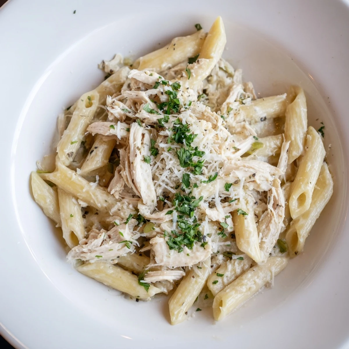 - Add the Italian herbs, a pinch of salt, and some black pepper, then fold in the shredded chicken and cooked penne. Toss everything together until every piece of pasta is coated, adding a splash of that reserved pasta water if it looks too thick.