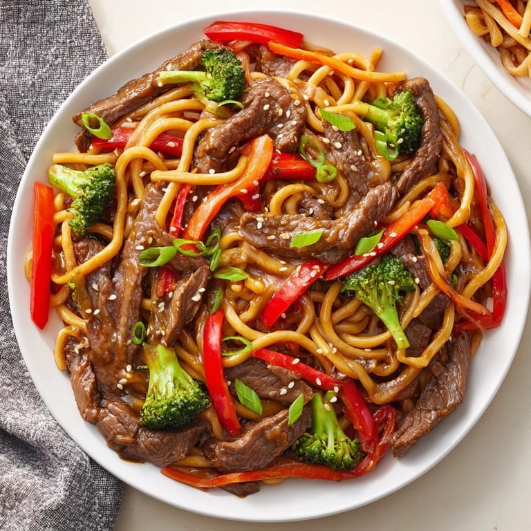 Save A quick and flavorful dish featuring tender beef strips, crisp vegetables, and chewy lo mein noodles tossed in a savory sauce&mdashperfect for busy weeknights.