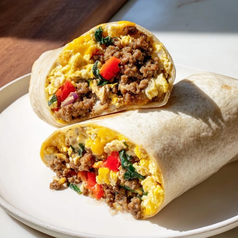 Save Hearty and flavorful breakfast burritos filled with eggs, sausage, vegetables, and cheese, perfect for meal prep and busy mornings.