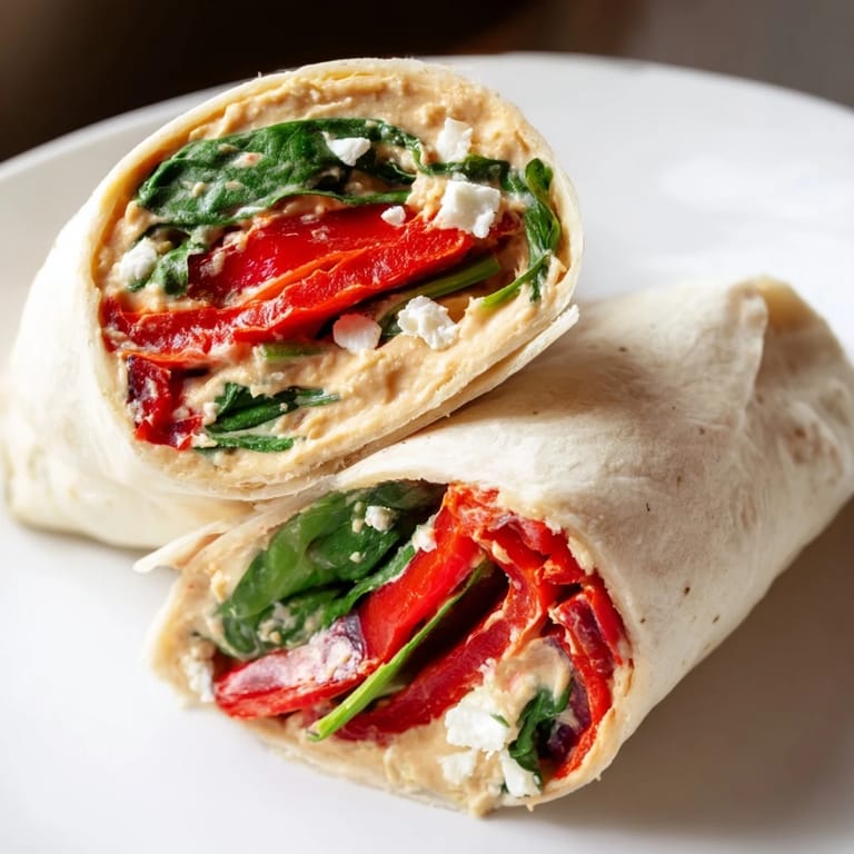 Save I threw this wrap together one sticky August afternoon when the thought of turning on the stove made me want to lie on the kitchen floor instead. I had a tub of hummus, some jarred peppers from a dinner party weeks ago, and wilting spinach that needed saving. What started as fridge cleaning turned into something I now crave on repeat. The contrast of cool creamy hummus against the sweet smoky peppers and salty feta is the kind of simple magic that makes you wonder why you ever complicated lunch.
