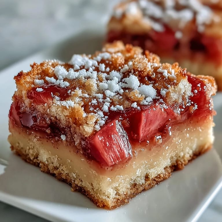 Save The sharp, tart aroma of rhubarb always seems to cut through the gentle hum of early spring, and it was that very scent drifting through my kitchen one rainy afternoon that convinced me to finally try these custard bars. I’d been staring at a bundle of ruby-red stalks on the counter, watching raindrops race each other down the window, when I remembered a friend raving about her grandmother’s infamous rhubarb desserts. With a little curiosity (and some impatience to taste something bright), I set to work, fingers dusted in flour and a playlist humming in the background. The first attempt wasn't perfect—my crust was too eager to crumble—but the combination of textures and the blushing custard filling made it utterly irresistible. Now, making these bars feels like inviting spring right into my kitchen, no matter the weather outside.