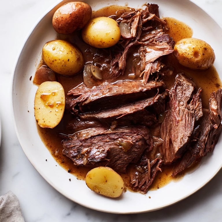 Serve slices or shredded beef with the cooked baby potatoes and spoon the flavorful juices over the top.
