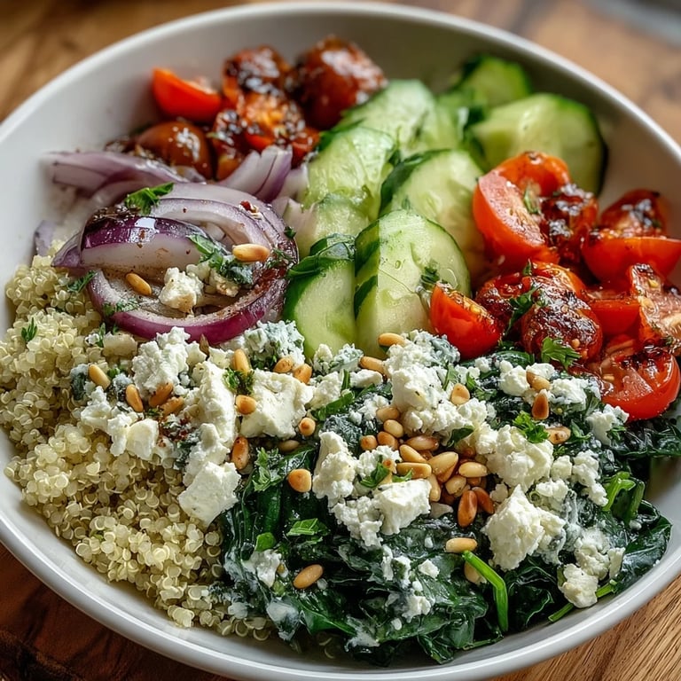 Save There's a Tuesday afternoon I keep coming back to, when my coworker brought this exact bowl to lunch and I spent more time staring at it than my own sandwich. The way the emerald spinach pooled against the golden grains, how the feta crumbles caught the light like little clouds—it looked too good to be something you could actually make at home in under an hour. Turns out, it was, and now it's become my go-to when I need to feel like I'm eating something that genuinely matters.